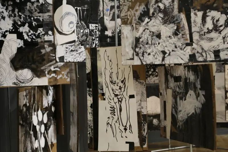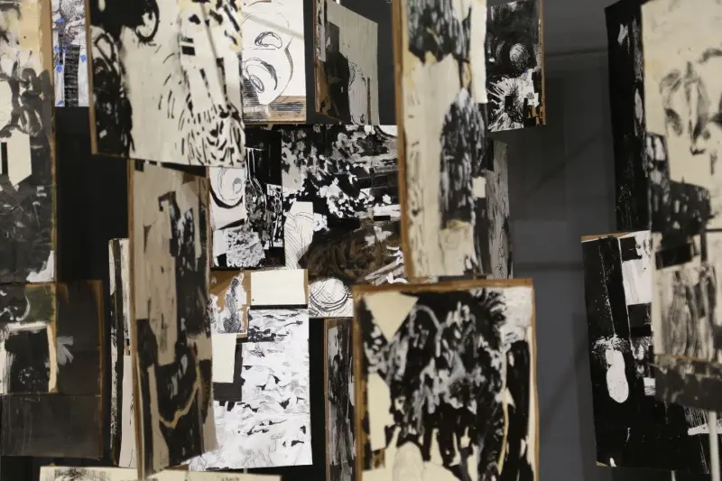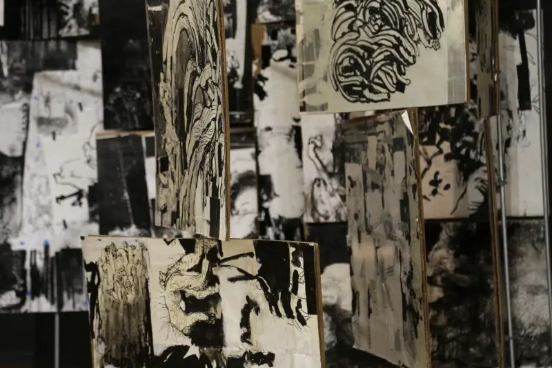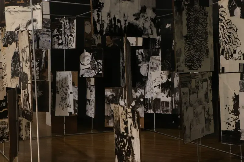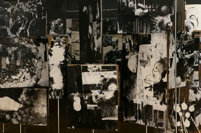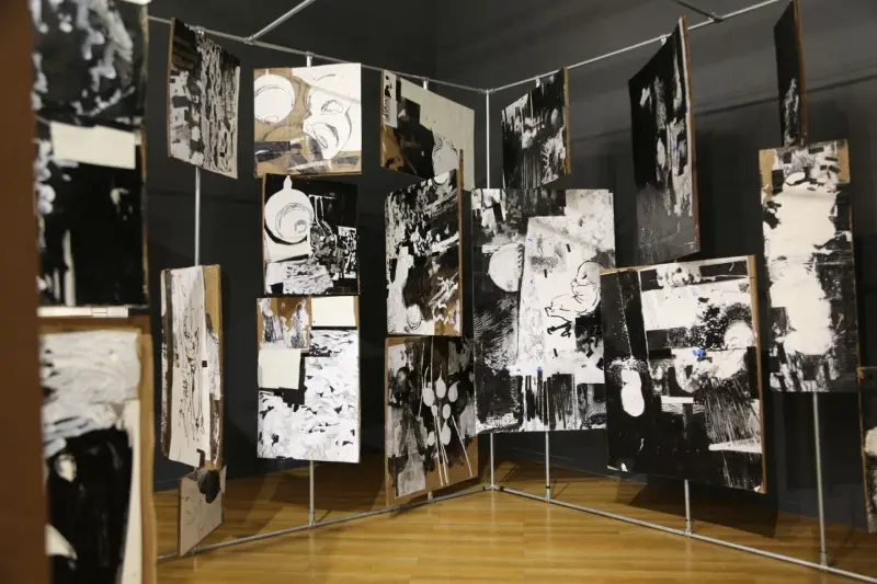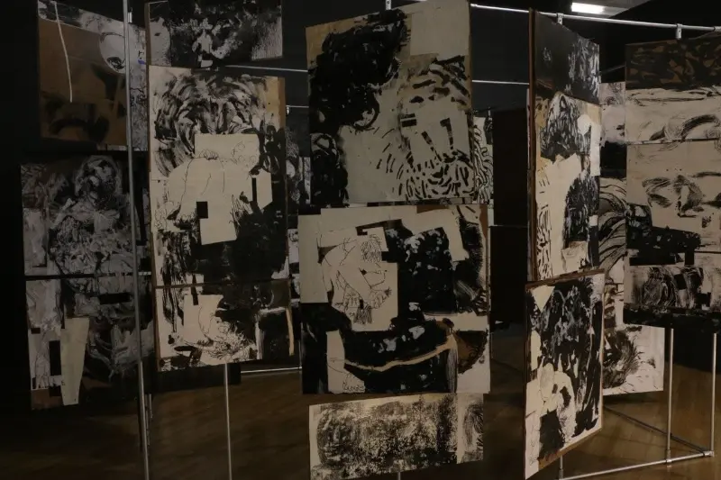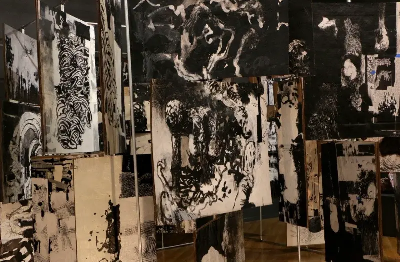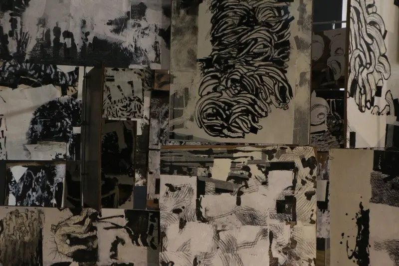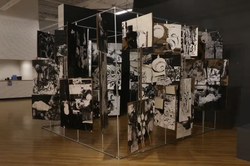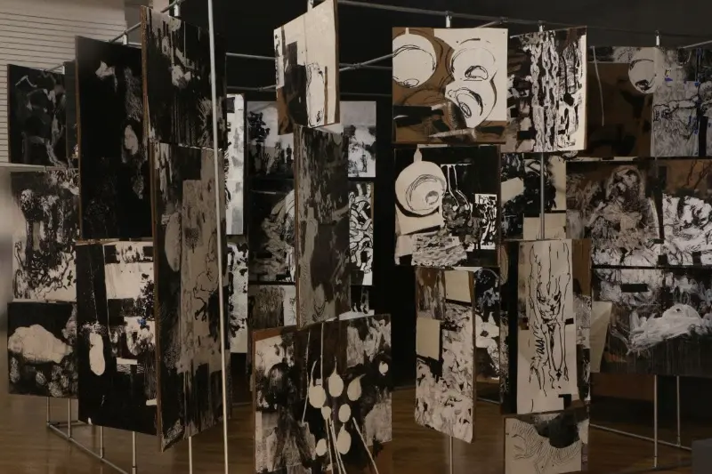 My work has evolved from narrative, story-telling images into pieces that are increasingly aware, present, and emotionally grounded. Although rooted in fiction, my practice draws heavily from real experiences, feelings, and personal reflections. Many of my works initially appear grotesque, yet they open into layered emotional spaces where empathy remains central. I see drawing and painting as capable of becoming sculptural, and spatially aware. Throughout my MFA, I have pursued this belief by building three-dimensional canvases, merging sculptural forms with painted surfaces, creating an illustrated book meant to be experienced over time, and developing an interactive room composed of rotating panels for my thesis.This approach has allowed me to see, compose, and build differently, shaping a practice that continues to expand my understanding of form and narrative. My work is in conversation with artists like Picasso, David Hockney, and Goya, yet it is equally informed by figures such as Darvish Khan Esfandiarpour whose Stone Garden stands as a monument to memory, loss, and resilience, and by many contemporary Iranian artists whose influence grounds my connection to home. Through this merging of artistic lineages, I explore themes of war, loss, and cultural identity, forming a bridge between traditions and contemporary experience.